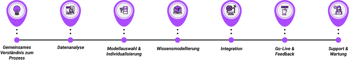 Ein weiterer zentraler Schritt ist die Wissensmodellierung. Hierbei wird das Prozesswissen strukturiert in Form von Klassen, Attributen und Regeln festgehalten. Parallel zu diesem technischen Aufbau unterstützt elevait mit gezielten Anwenderschulungen. Diese Schulungen sind darauf ausgelegt, das Team auf die praktische Anwendung der neuen KI-Lösung vorzubereiten und sicherzustellen, dass alle Anwender:innen die Technologie effektiv nutzen können.